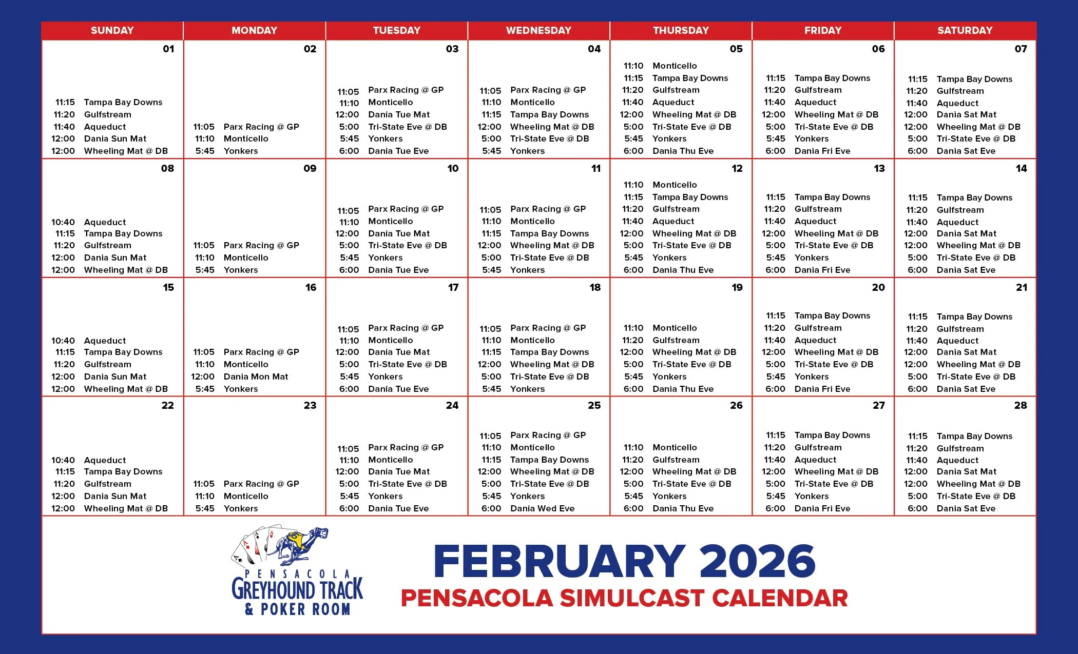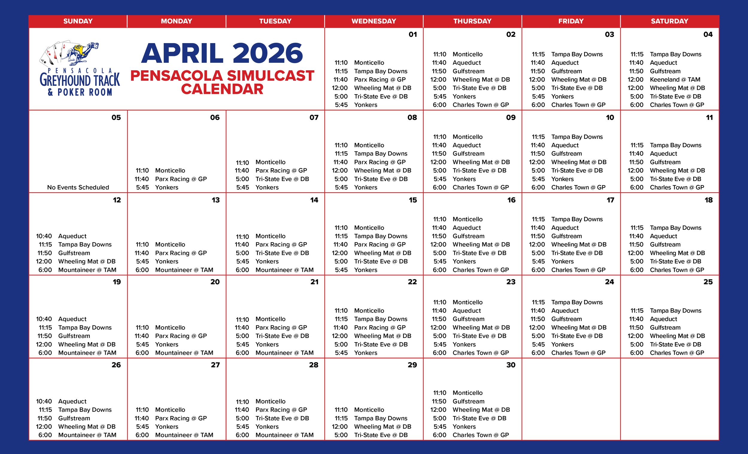 Simulcast is the simultaneous broadcasting of multiple races at different venues, shown on screens here at the Pensacola Greyhound Track. Racing fans interested to know what is happening around the area's racing tracks can watch live simulcasts from venues including Caliente, Gulfstream, United Kingdom Greyhound Tracks, Tri State, and Wheeling.
